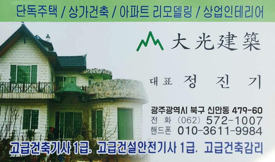 광주광역시집수리전문, 철거공사, 리모델링, 조립식판넬, 옥상방수, 페인트공사, 조립식창고, 데크시공, 누수탐지, 대광건축